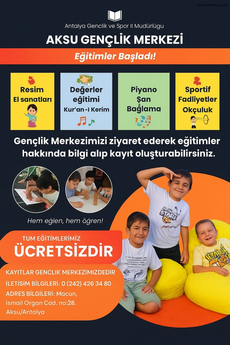 Aksu Gençlik Merkezi’nde bu dönem; resim, el sanatları, değerler eğitimi, Kur’an-ı Kerim, piyano, şan, bağlama, zeka oyunları, İngilizce, sportif faaliyetler ve okçuluk gibi pek çok alanda eğitim verilecek. Kurslara ilginin yoğun olduğu öğrenilirken, yetkililer tüm eğitimlerin tamamen ücretsiz olduğunu vurguladı.