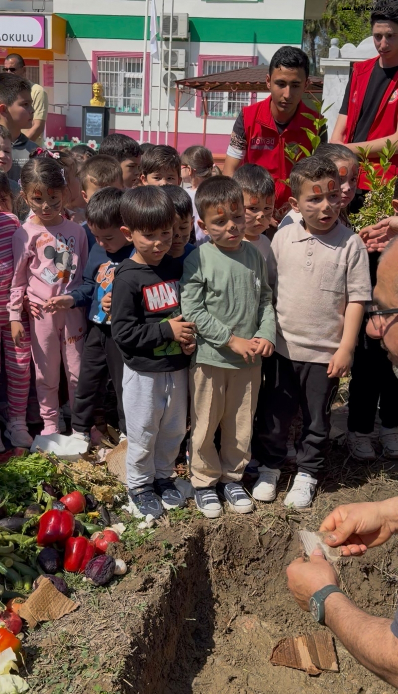 Melek Mustafa Hamursuz Anaokulu öğrencilerinin katıldığı programda, “Sıfır Atık” projesi kapsamında atık malzemelerden kompost yapımı uygulamalı olarak anlatıldı.